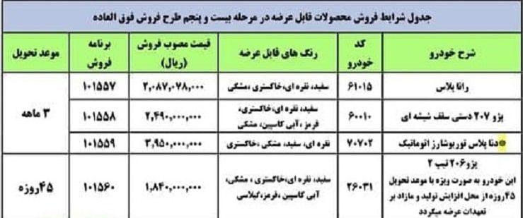 کلانشهر: به اطلاع عموم متقاضیان محترم و نمایندگیهای مجاز میرساند شرایط فروش فوق العاده برخی از محصولات ایران خودرو با موعد تحویل (حداکثر ۳ ماهه) و از طریق قرعه کشی به شرح جدول ذیل ارائه می شود.