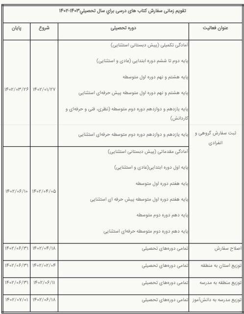 کلانشهر: ثبت سفارش کتابهای درسی سال تحصیلی ۱۴۰۳-۱۴۰۲ دورههای تحصیلی آموزش ابتدایی، متوسطه اول، متوسطه دوم و کتابهای درسی تکمیلی دوره اول متوسطه ویژه دانشآموزان استعدادهای درخشان و همچنین کتابهای درسی دانشآموزان استثنایی از طریق سامانه www.irtextbook.ir و برابر جدول تقویم زمانی زیر انجام و پیرو آن کتابهای درسی، بر اساس سفارشات ثبت شده در سامانه، توزیع می شود: