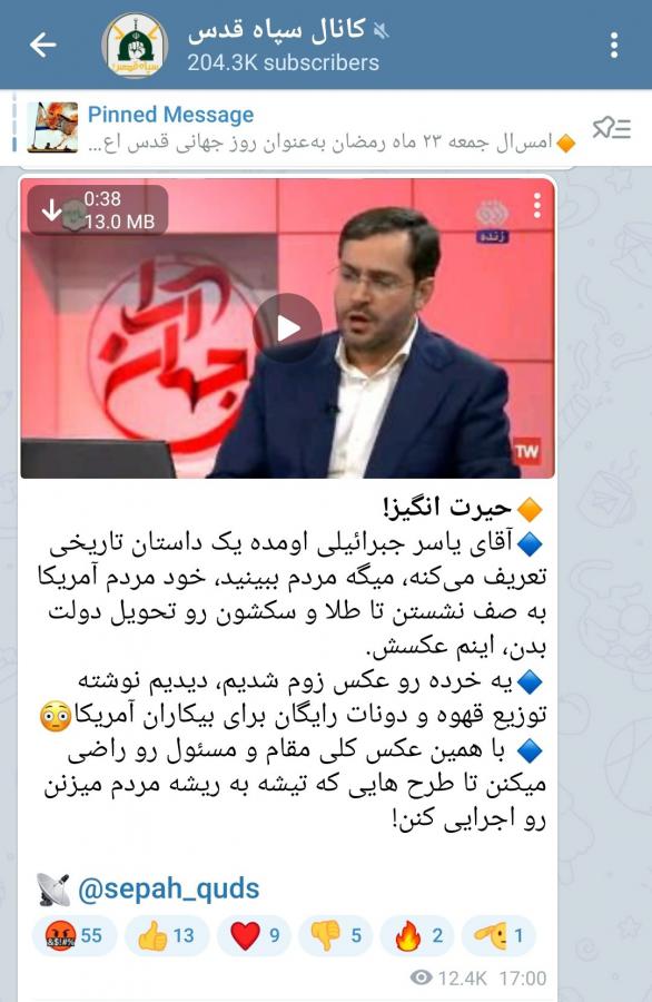 یاسر جبرائیلی که دانش آموخته دکترای اندیشه سیاسی و رئیس مرکز ارزیابی و نظارت راهبردی اجرای سیاستهای کلی نظام است با اشاره به واکنش ها به این اشتباهش نوشت:بعید است سپاه قدس کانال خبری در تلگرام داشته باشد و این کانال در حال سوء استفاده از نام سپاه قدس است. علی ای حال، عکس امضای فرمان اجرایی ۶۱۰۲ توسط روزولت را ندیدهاند، تصویر فرمان را ندیدهاند، به عکس صف گیر دادهاند! عذرخواهم. باید برای نمایش صف از آدمک استفاده می کردم...