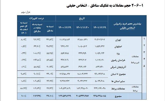 بیشترین حجم خرید و فروش اشخاص حقیقی در بازار سرمایه در اسفندماه سال گذشته توسط ساکنان استان تهران و پس از آن توسط ساکنان استان اصفهان انجام شده است.