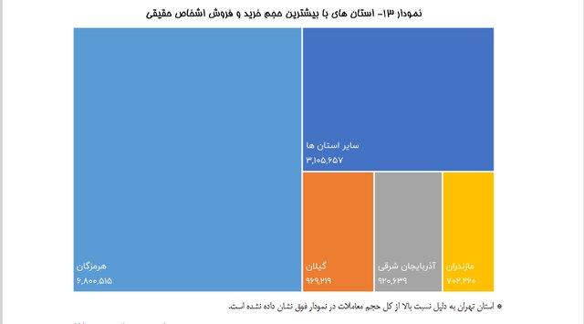 پس از آن ساکنان استانهای اصفهان، یزد، خراسان رضوی و آذربایجان شرقی به ترتیب بیشترین حجم خرید و فروش اشخاص حقیقی را از آن خود کردند.