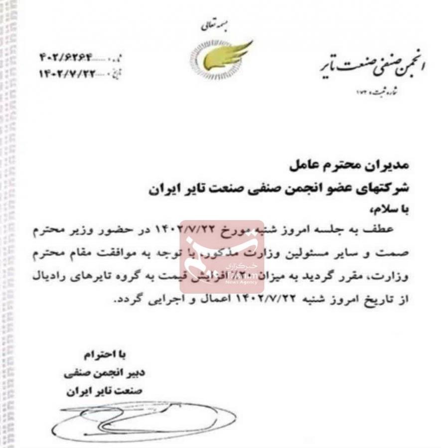 کلانشهر: دبیر انجمن صنفی صنعت تایر ایران در نامه ای به شرکتهای عضو انجمن صنفی صنعت تایر نوشت: عطف به جلسه شنبه مورخ 22 مهر 1402 در حضور وزیر محترم صمت و سایر مسئولین وزارت مذکور، با توجه به موافقت مقام محترم وزارت، مقرر گردید به میزان 20 درصد افزایش قیمت به گروه تایرهای رادیال از تاریخ شنبه 22 مهر 1402 اعمال و اجرایی گردد.