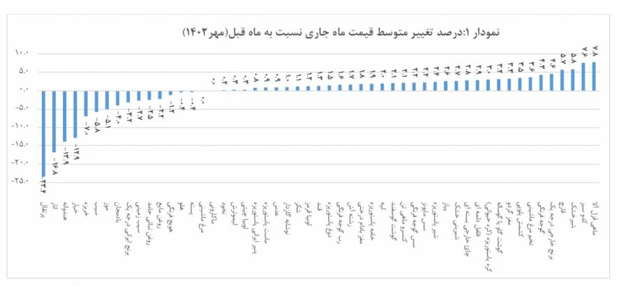 در گروه سبزیجات و حبوبات نیز، بیشترین افزایش قیمت نسبت به ماه قبل مربوط به" کدو سبز " با ٧,٦ درصد ،" قارچ" با ٥.٧ درصد و " گوجه فرنگی" با ٤.٣ درصد و همچنین بیشترین کاهش قیمت مربوط به "خیار" با ١٢.٩- درصد، "بادمجان" با ٤.٠- درصد و "سیب زمینی" با ٢.٧- درصد است.