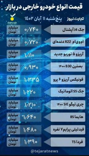 قیمت خودرو امروز پنجشنبه 11 آبان 1402 به صورت با ثبات گزارش میشود. البته افت و خیز قیمت نیز در بازار خودروهای داخلی و مونتاژی به صورت محدود قابل مشاهده است.