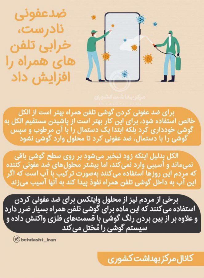 کلانشهر: کانال مرکز بهداشت کشوری در اینفوگرافیکی نسبت به خرابی تلفنهای همراه در اثر ضدعفونی غیراصولی هشدار داده است. کرونا هر روز چالش جدیدی برای زندگی انسان به وجود میآورد و زندگی با کرونا، اجتنابهای بسیار بیشتری پیدا کرده است.